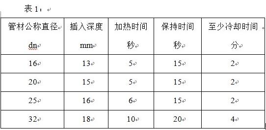 4)從現在開始即進入加熱時間,并加熱至表1中規(guī)定的時間。規(guī)定的加熱時間到達后,從加熱模頭上拔出管材和管件,拔出速度應適中,不能過急,但可以略帶輕微的抖動動作,以利于拔出。
