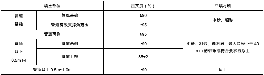 十七、管道管頂 0.5m 以上部位回填土的壓實度,應按相應的場地或道路設計要求確定,不宜小于90%;管頂 0.5m 以下各部位回填土應符合下表的規(guī)定。