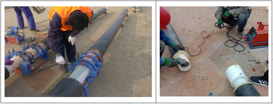 3、電熔連接,操作要點(diǎn):將管材表面打磨后插入電熔管件中,利用電熔焊機(jī)和電熔管件通電加熱,達(dá)到焊接目的,適用于dn20-dn315管材、管件。