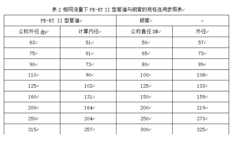 與鋼管比較,PE-RT II型管道的摩擦阻力小,同樣內(nèi)徑的管材流量是鋼管的1.25倍,隨著鋼管的腐蝕,內(nèi)壁會(huì)變得更加粗糙,流量也會(huì)逐年降低,相同流量的情況下,PE-RT II型管道與鋼管的規(guī)格選型見(jiàn)表2