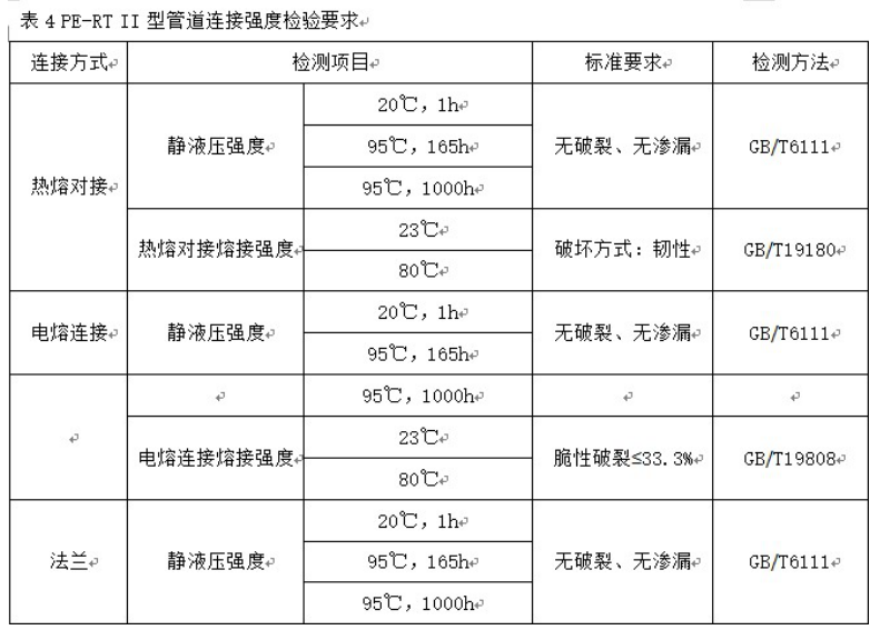 PE-RT II型管材、管件參照GB/T28799-2012執(zhí)行,管道連接強(qiáng)度要求詳見(jiàn)表4